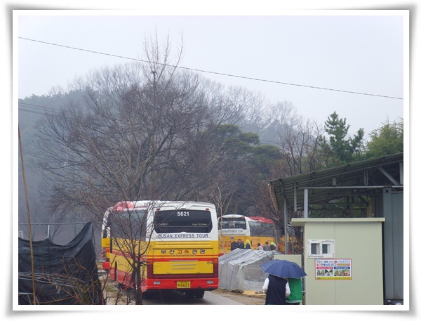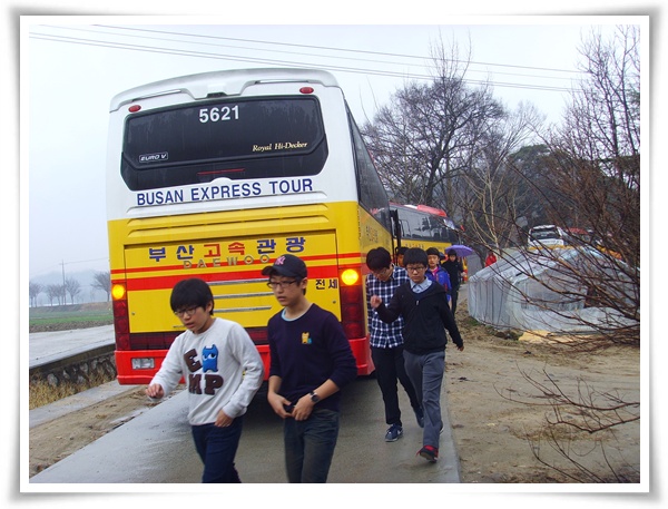봄비를 뚫고 버스 6대에 중학생들이 타고 수학여행을 왔네요.