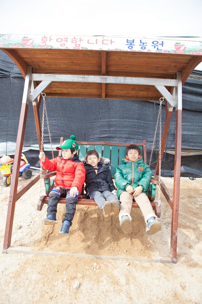 딸기따기체험을 마친 아이들을 편안하게 나무그네를 타고 있습니다.