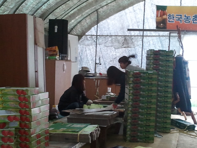 열심히 포장된 딸기에 스티커를 붙이고 있다가