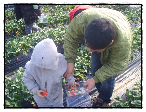 파란건 따면 안된다!!!하면서 아빠가 아이에게 딸기따는 법을 가르켜주네요.
