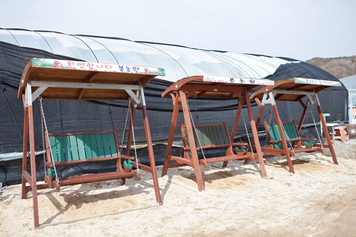 딸기따기체험을 마친 아이들을 편안하게 나무그네를 타고 있습니다.