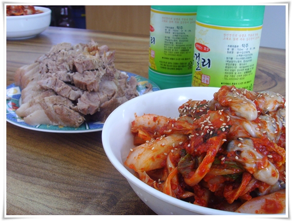 갓담은 김치 한사발놓고 돼지고기 수육에