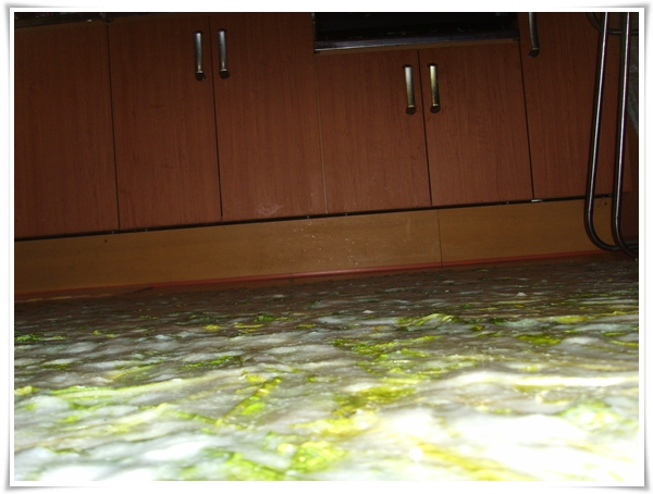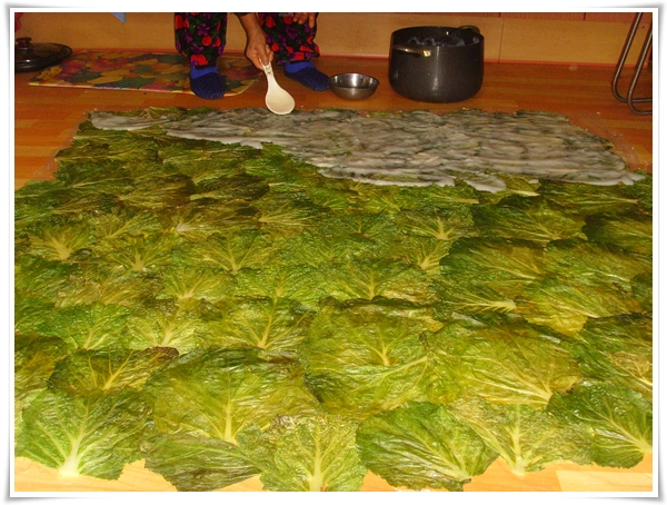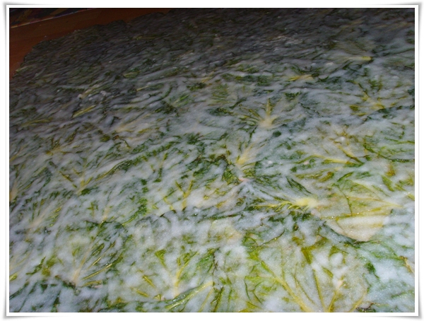 방에 깔아놓은 비닐위에 삶은 배추를 하나씩 펴서 늘고..