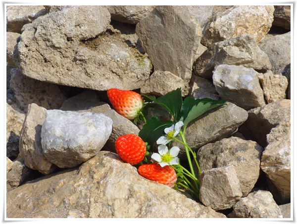 돌틈사이에 이렇게 딸기와 딸기꽃을 올려놓으시더니
