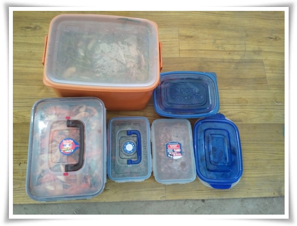 다 들지를 못해서 손수레에 끌고 작업장으로 가지고 온 반찬통들...