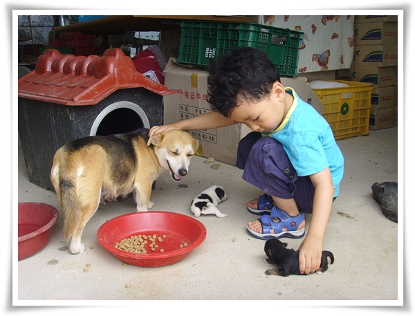 자연스럽게 어미개도 쓰다듬어주고 새끼도 쓰담듬어주는