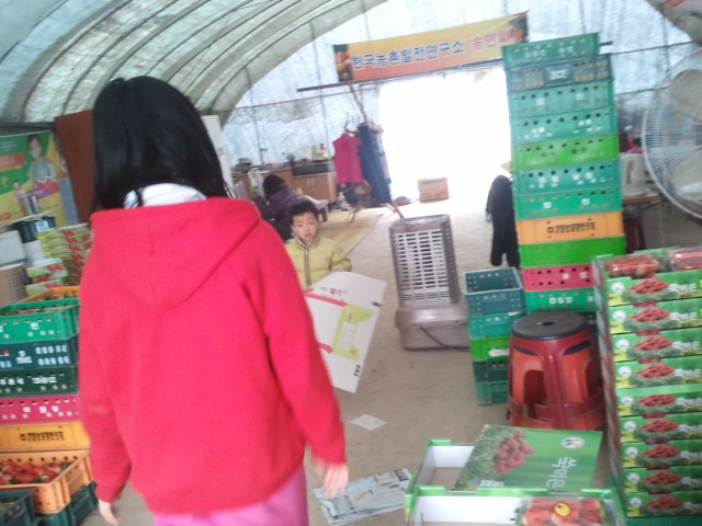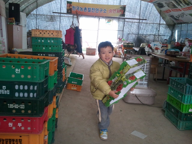 누나가 접어놓은 딸기박스를 저에게 갖다주고 있는 막내...