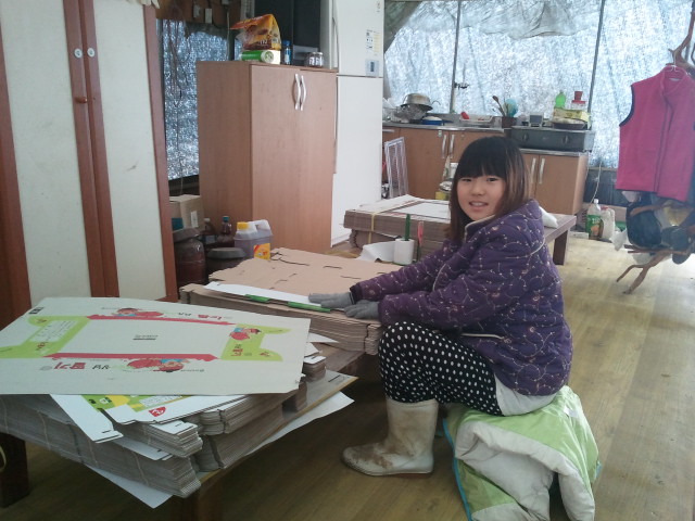 그리고 둘째는 한켠에 자리를 잡고 열심히 딸기박스를 접고 있습니다.