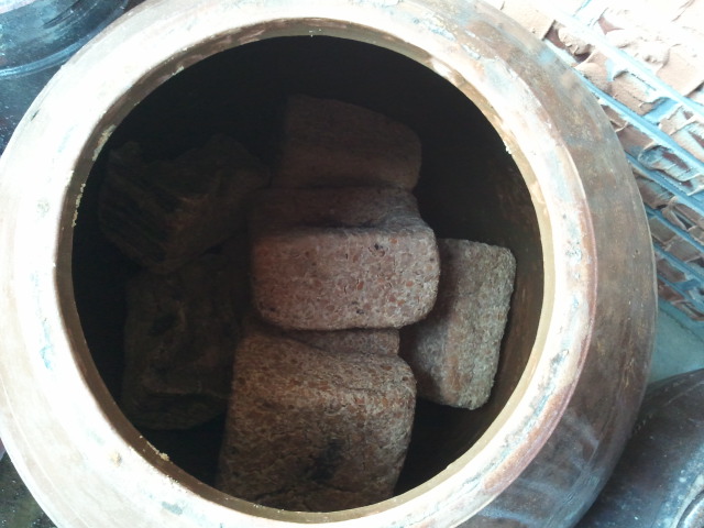 깨끗이 소독한 장독에 씻은 메주를 넣고....