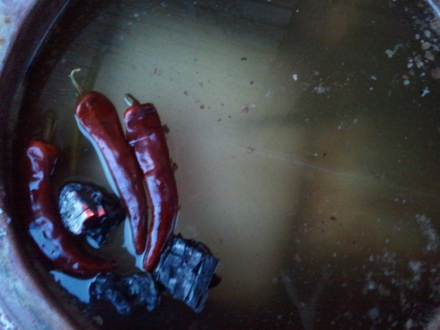 그리고 빨간 고추와 숯을 넣어서 마무리를 합니다.