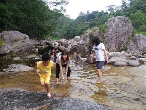 내려오는 길에 계곡에 잠시들려 아이들과 함께 시원한 물에 발도 담구어 보았다.