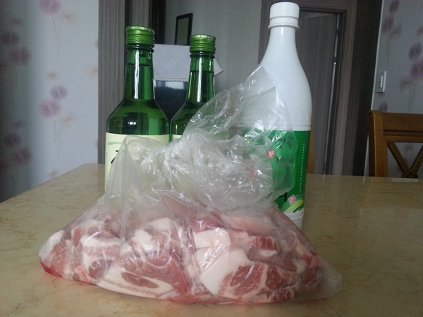 삼겹살에 막걸리랑 소주 2병을 사가지고 오네요...헐~~~
