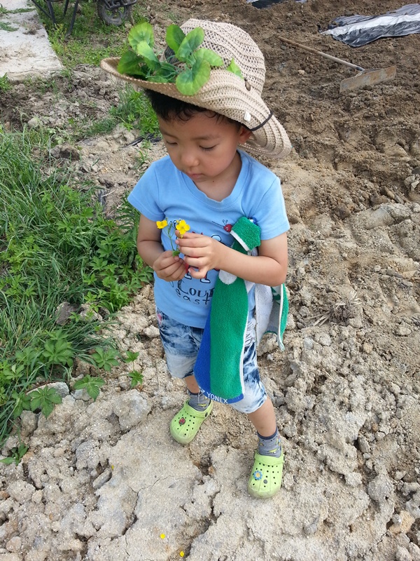 밭가에 피어있는 꽃을 보고 이쁘다고 한참을 들여다보고 있다.