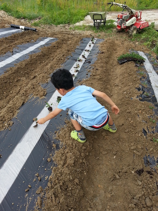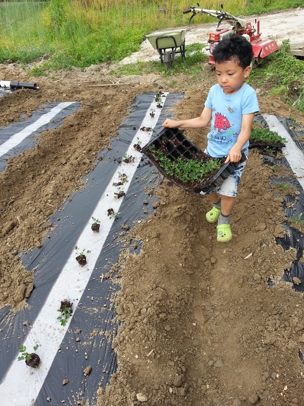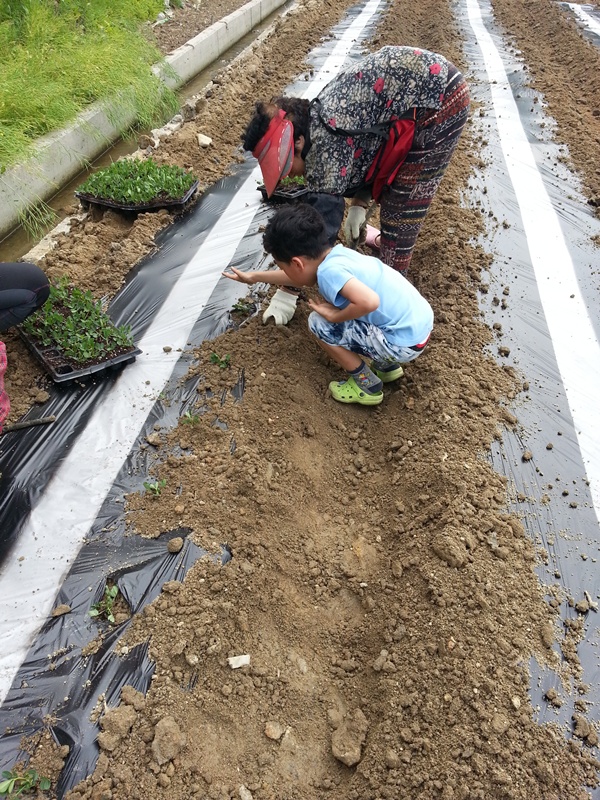 엄마랑 할머니가 심기 쉽게 모종을 하나씩 빼서 간격에 맞게 올려준다.