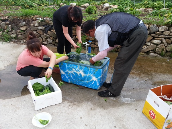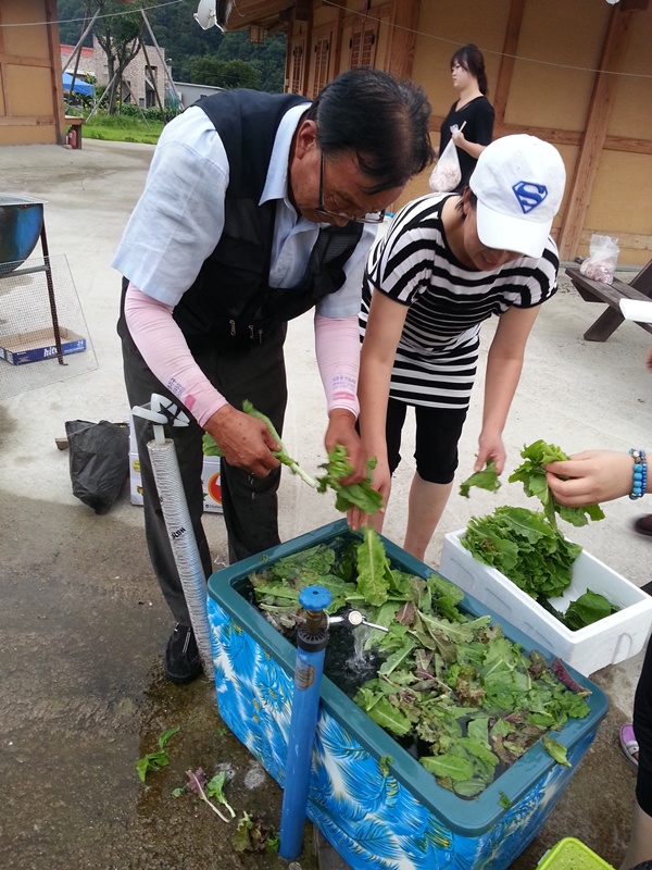 직접 재배한 상추랑 깻잎을 따가지고 오셔서 함께 씻고 있다.