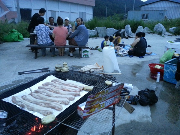 맛나게 구운 고기를 식구들이 모여 맛나게 먹고.