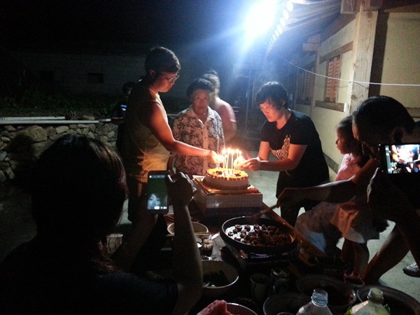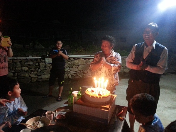 저녁에 도착한 막내 동생식구들과 생일케이크에 불을 켜고...