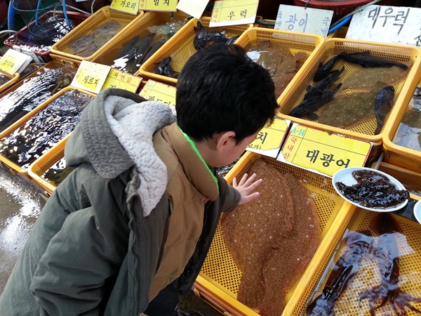 수산시장에서는 자기 손바닥보다 더 큰 물고기를 보고
