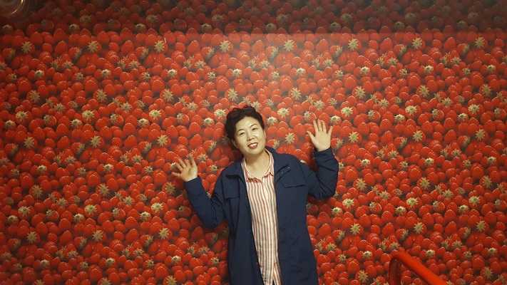 경주 게스트하우스 휴게실이 온통 딸기벽지로 도배를 했네요.