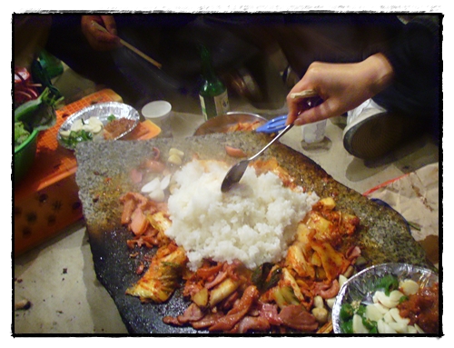 이렇게 작업장에 있는 돌위에 삼겹살과 김치를 넣고