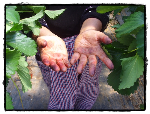 거칠고 거친 손마디에 어느새 딸기물이 곱게(?) 물들어있다.