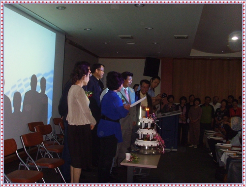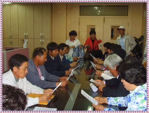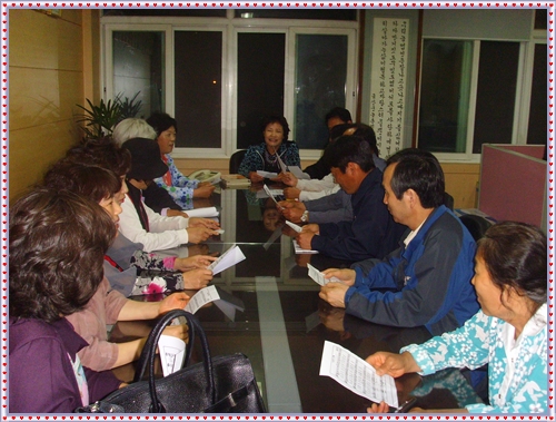 총회겸 체육대회 준비사항을 의논하고 모두들 "스승의은혜" 노래를 연습하고 계신다.