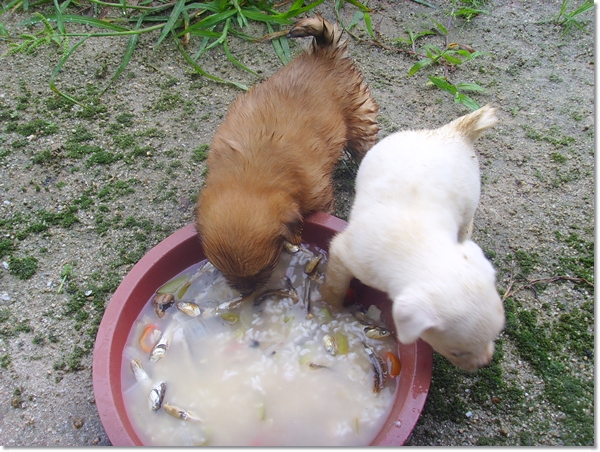 강아지들이 다 먹고나니 그제서야 자신의 배를 채운다.