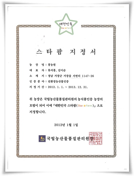 바로 "대한민국 스타팜 지정서"를 들고 오셨습니다.