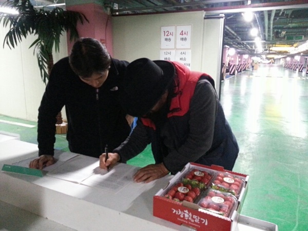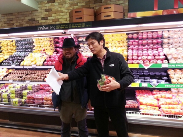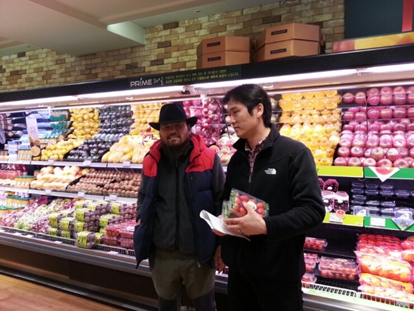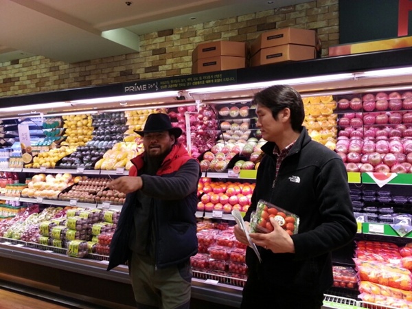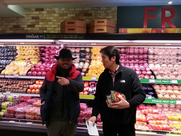 대우백화점 담당자분과 딸기놓을 자리를 상의하고 있습니다.