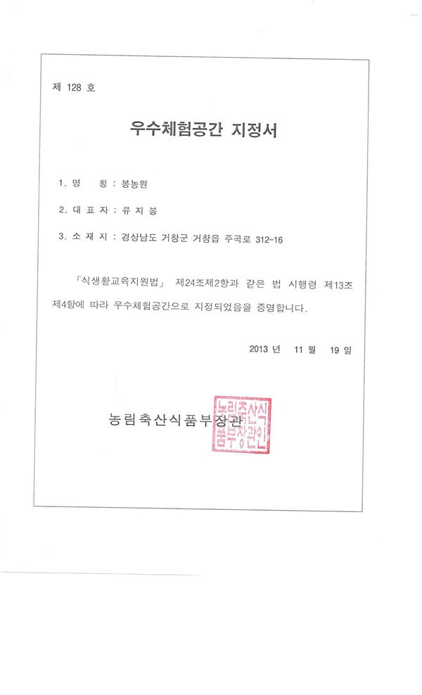 올해 식생활교육 우수농어촌체험공간으로 지정이 되어서