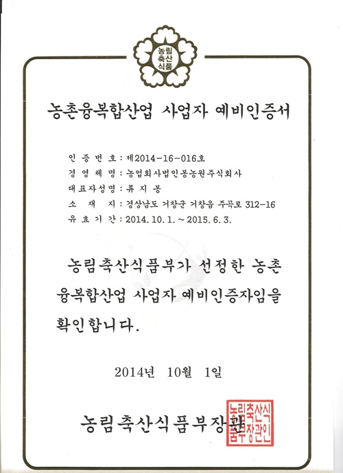 저희 봉농원도 이번에 6차산업예비인증자로 선정이 되었습니다.