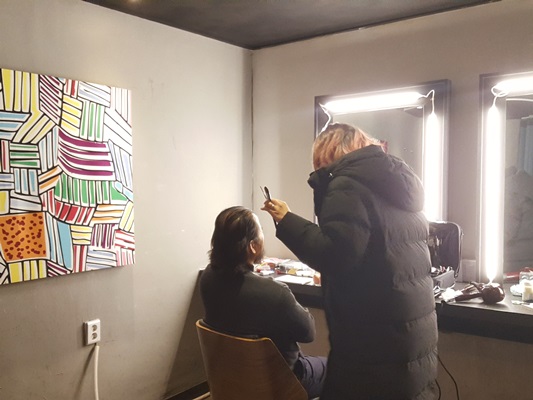 난생처음 해보는 방송촬영 분장을 하는 남편의 뒷모습이