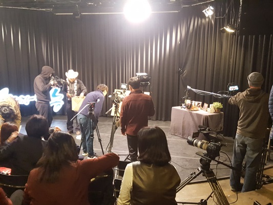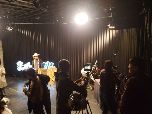 밝은 조명아래 많은 카메라와 스텝들