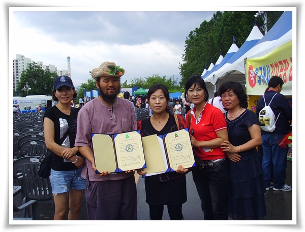 자매결연 증서를 받기전에 무대위에서 대기하고 있는 봉농원 주인장