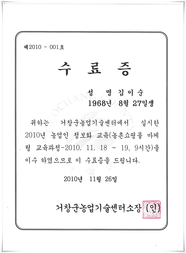 농업인정보화 교육 수료증