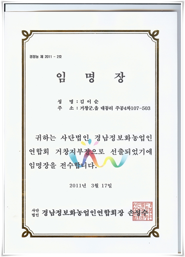거창사이버농업인 연구회 회장임명장...