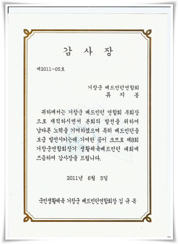 거창군 생활체육회에 공로를 인정받아서 감사장 받았습니다.
