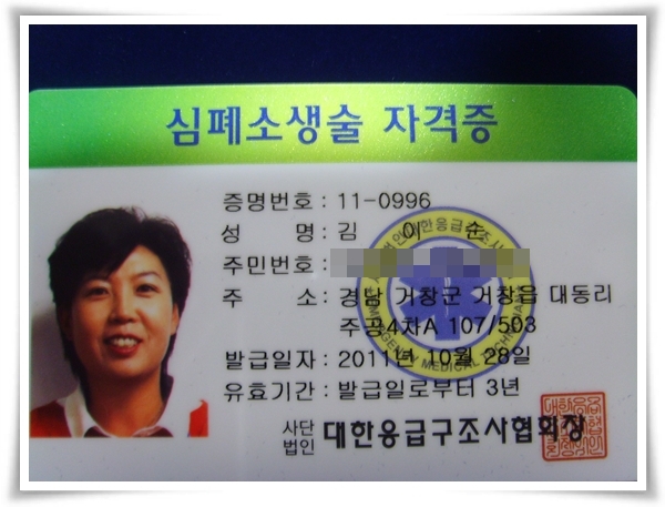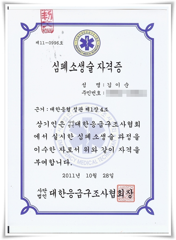 심폐소생술 교육을 받고 자격증을 취득하였습니다.