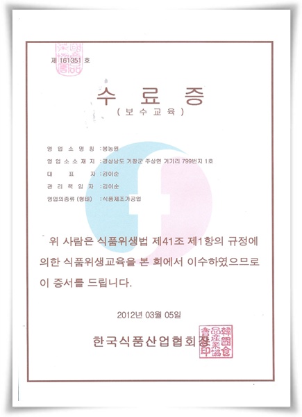 식품위생교육 수료증