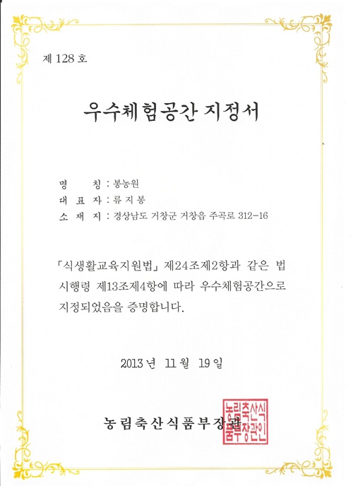 식생활교육 우수농어촌체험공간으로 지정되었습니다.