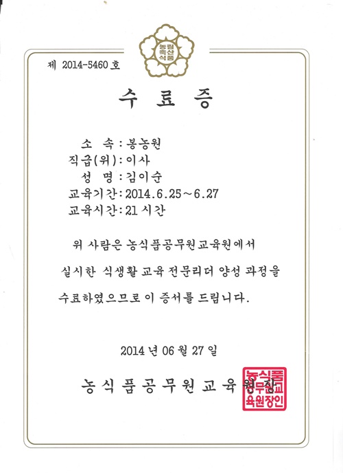 식생활교육전문리더양성과정 수료