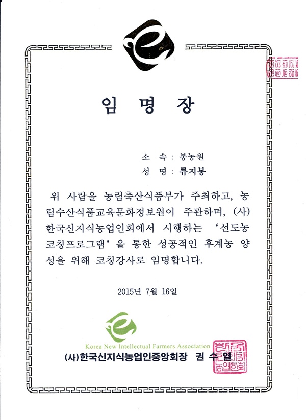 후계농양성 코칭강사 임명장