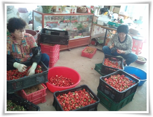 농장일을 도와주시는 아주머니들께서는 딸기꼭지를 제거하고 있으면