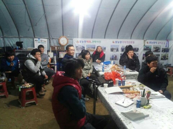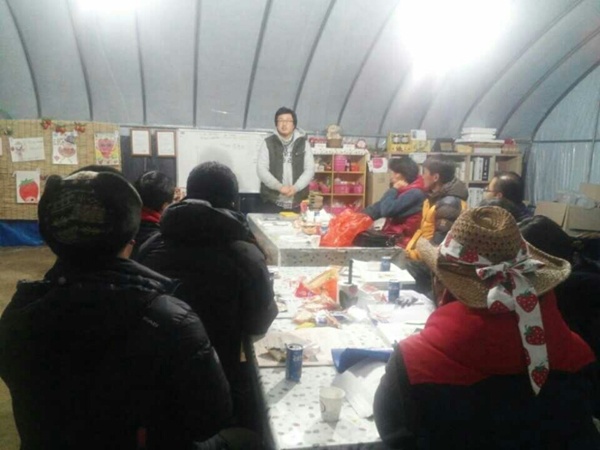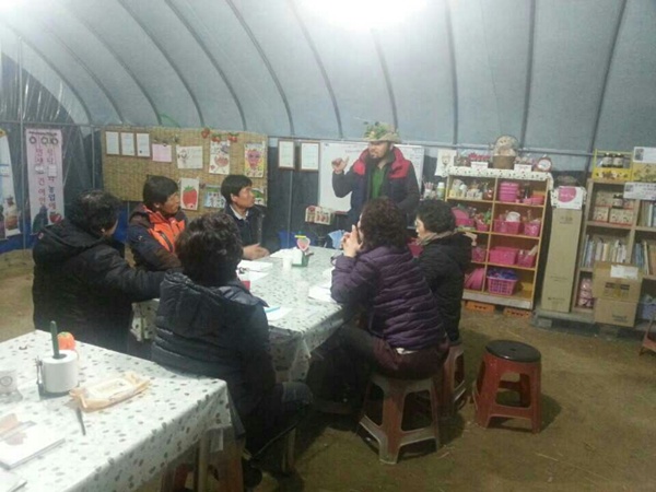 딸기농사를 잘 짓고 있는 선배에게 사례를 듣고 있다.