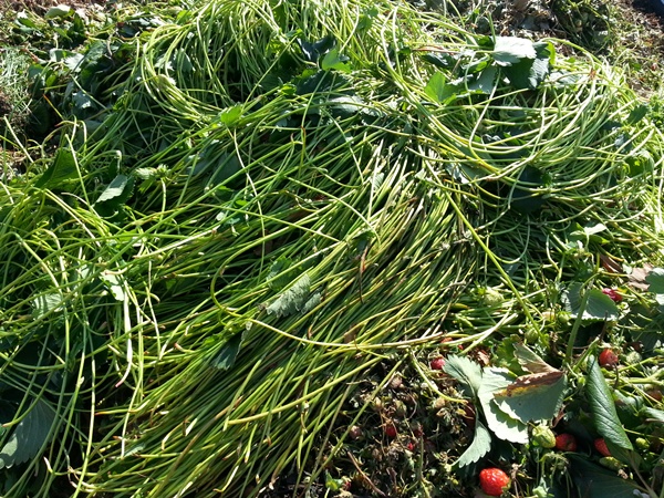 딸기하우스로 들어가 딸기런너 제거작업과