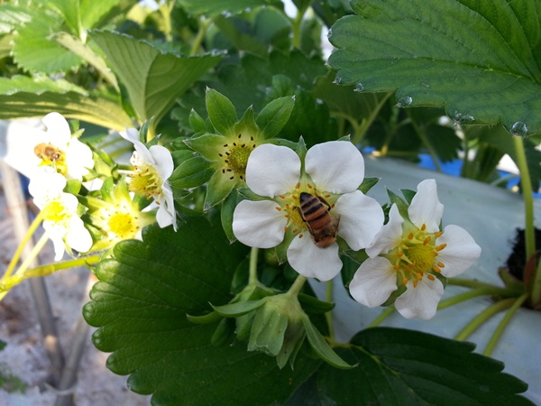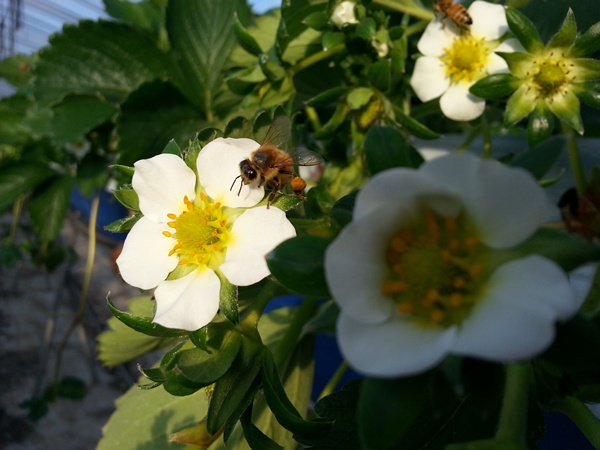 벌들이 날아나와 이렇게 딸기꽃위를 열심히