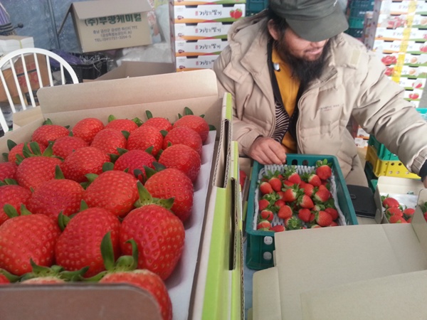 택배를 보낼 최상의 딸기들을 주인장께서 직접 포장을 하고...