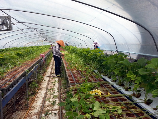 무더운 날씨에 딸기하우스에서 이마와 등줄기를 타고 내리는