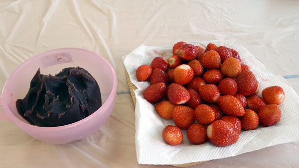 딸기를 팥고물로 감쌀겁니다.