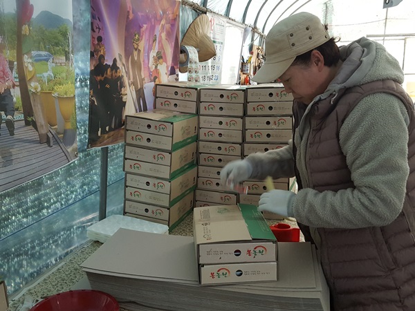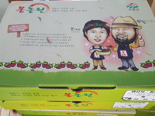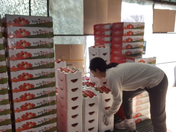 남편이 정성스럽게 담은 딸기들을 포장박스에 담아서
